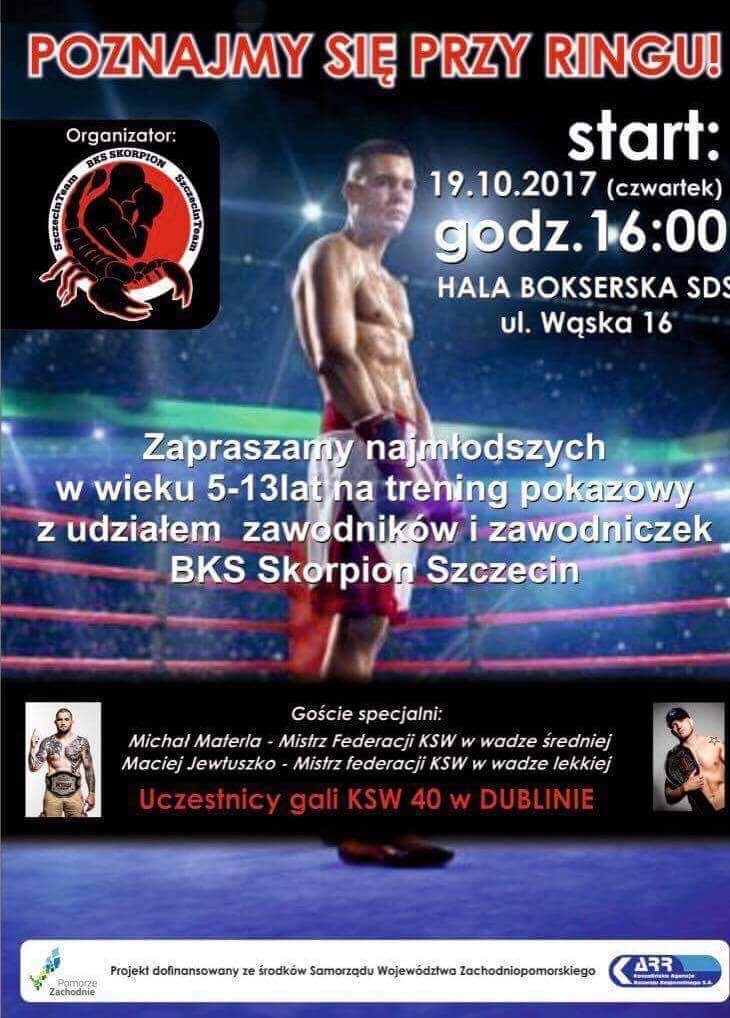 Poznajmy się przy ringu – trening pokazowy z udziałem zawodników i zawodniczek BKS Skorpion Szczecin. Zapraszamy najmłodszych w wieku 5 – 13 lat. Gośćmi specjalnymi będą: Michał Materla i Maciej Jewłuszko.
